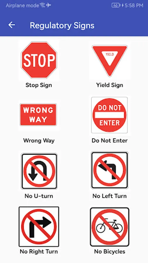 Road signs are assigned into different groups, e.g. warning signs, regulatory signs. And they can be shown in a list or flashcard mode. An easy way for you to learn these signs.