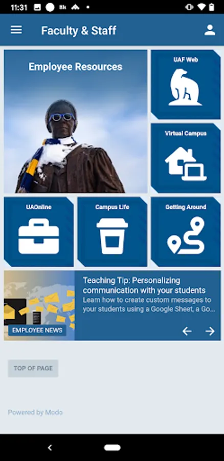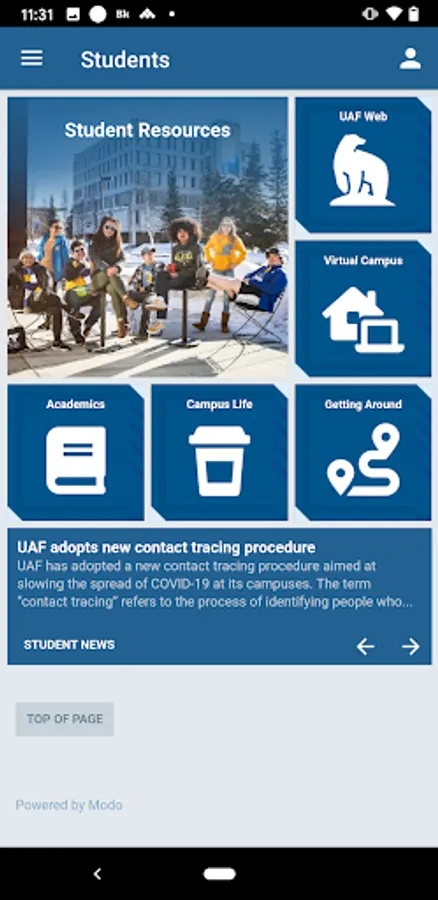 Get the info you need from UAF fast—academics; getting around campus with maps, parking and shuttle tracking; campus life events, activities and news; housing info; dining, menus and locations; health and safety info; social media channels; and more.