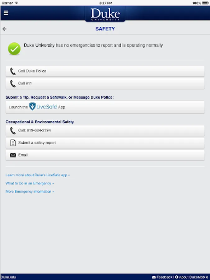 · Emergency Alert Information — Be aware of any emergencies on campus, and get one-click access to Duke Police, the Occupational & Environmental Safety Office and other emergency contacts.