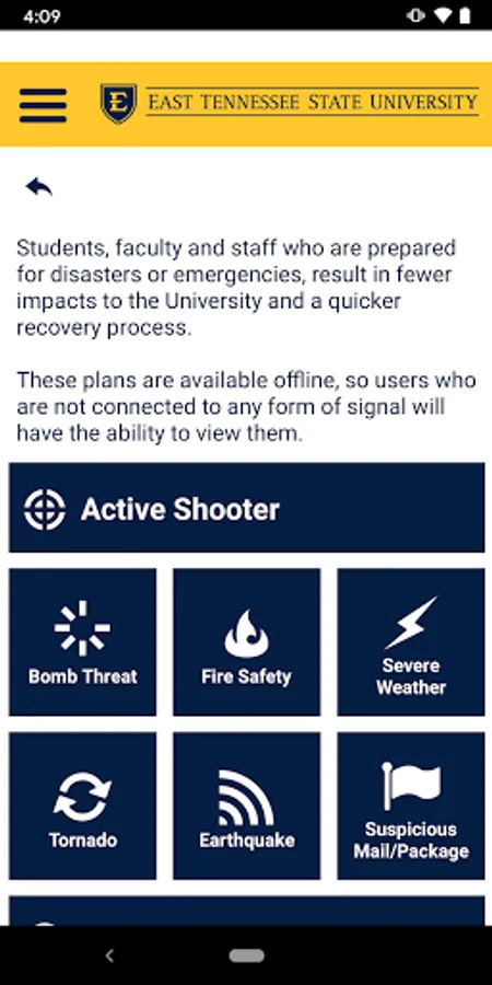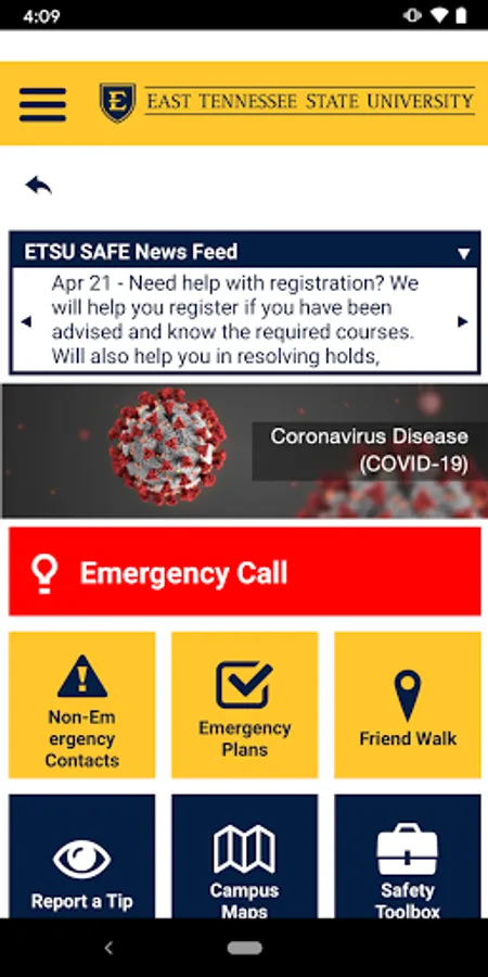 This is the official mobile app of East Tennessee State University. The app is fully integrated with ETSU's safety and security systems, providing students, faculty and staff with added safety on the ETSU campus.