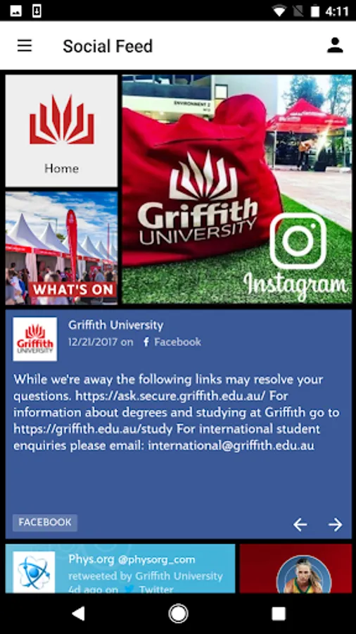 - Social Feed: aggregated feed of social media and news from Griffith.