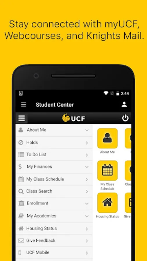 Check out the mobile version of some of the myUCF Student Self Service options. Update your personal information, direct deposit, and manage your class enrollment. View your class schedule, grades, holds and to do list, advisors, financial aid, account information, and housing status.