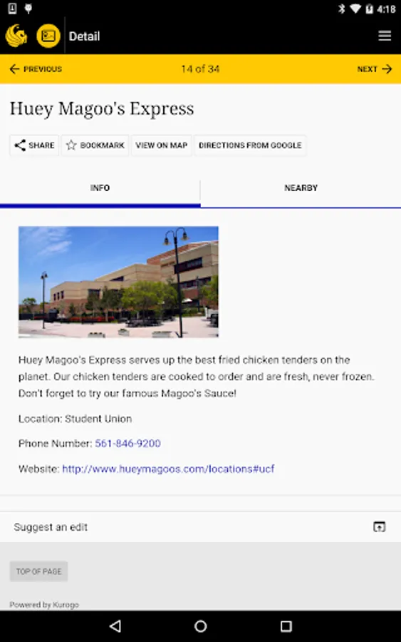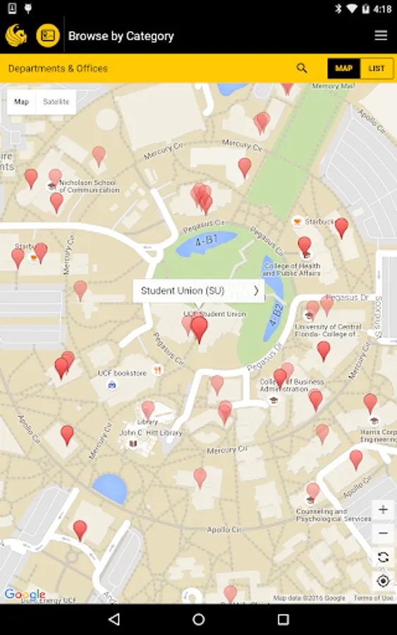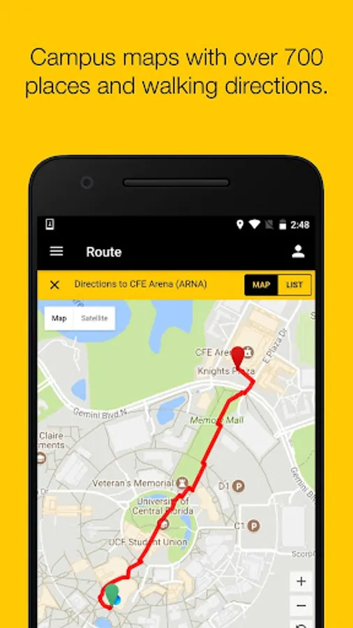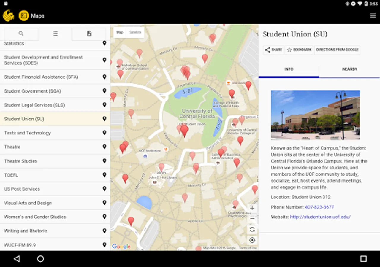 Over 700 points of interests which includes buildings, departments, services, parking, dining, retail, and much more. Other features include what's nearby, GPS location, and walking directions.