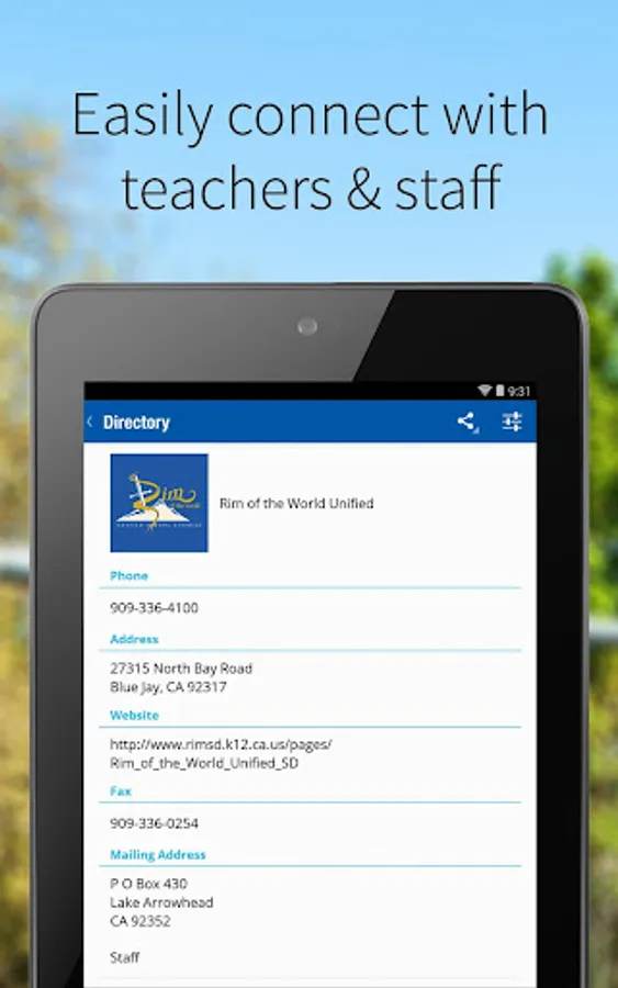 The official Rim of the World USD app gives you a personalized window into what is happening at the district and schools. Get the news and information that you care about and get involved.