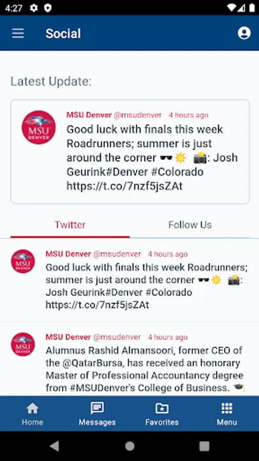 The MSU Denver mobile app helps you stay connected with Metropolitan State University of Denver through your mobile device. The app contains a suite of resources that include quick access to Blackboard Student, news, events, schedules and catalogs, Auraria Library, RTD information, maps, and people and department directories. Additional features include access to the Student and Faculty Hub and more!