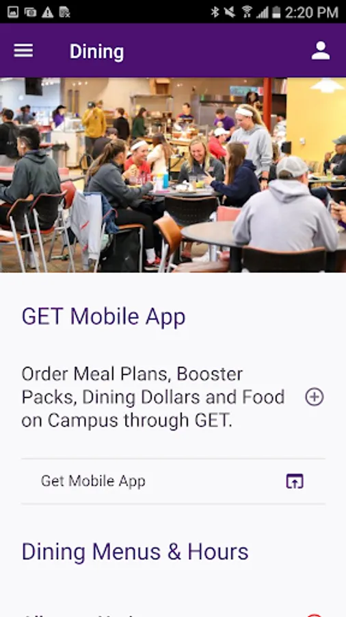 Dining—Check out daily menus at all dining locations. You can also order meal plans, booster packs, dining dollars and food on campus through the GET mobile app.
