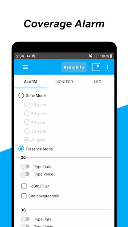 • Network coverage alarm: audible alarm when selected network (4G LTE, 5G, 3G) becomes available/unavailable.