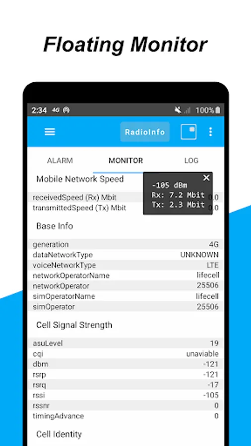 • Floating monitor: signal strength and network speed info.