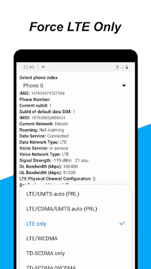 • Force LTE only, 5G, 3G network mode.