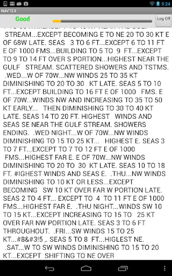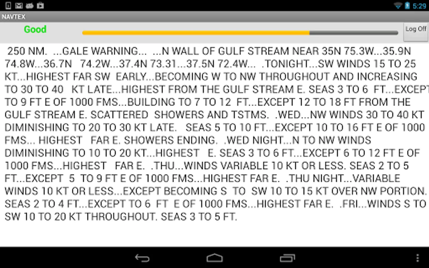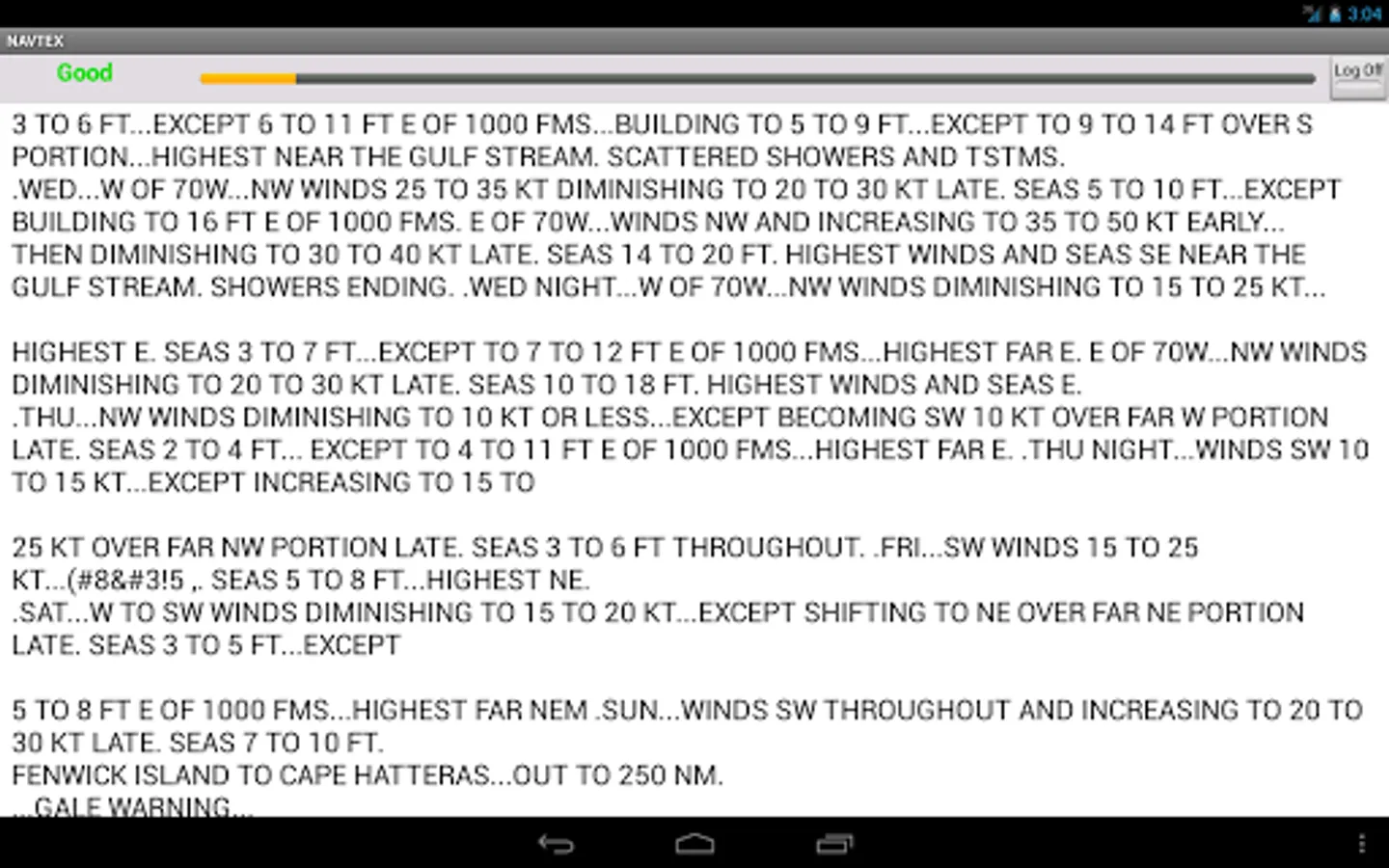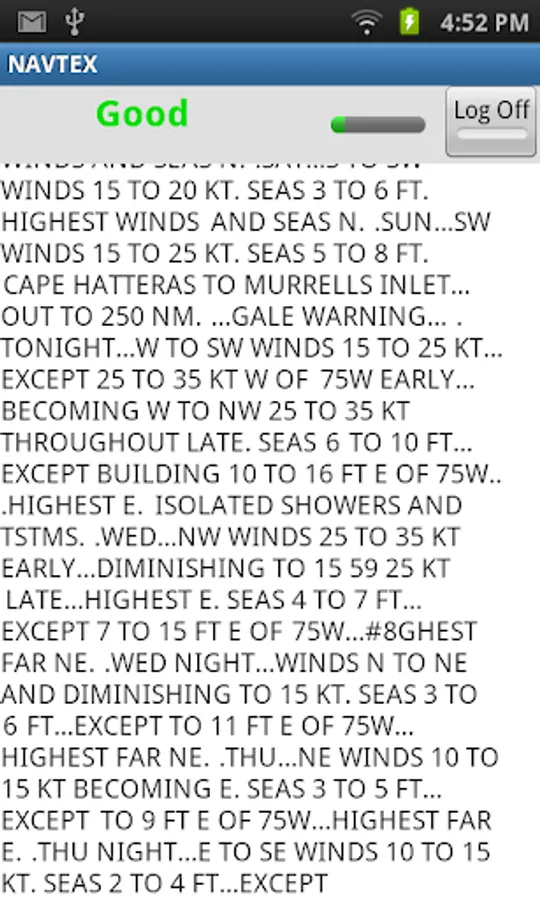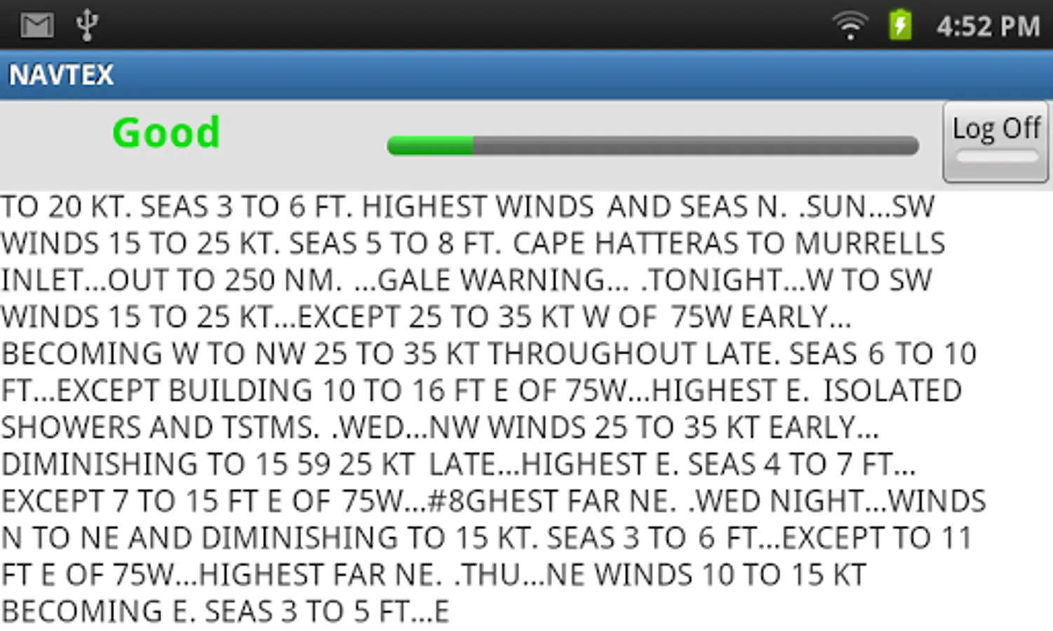 NAVTEX Decoder lets you view NAVTEX marine weather transmissions on your Android device. Just set it near a radio (or for better quality decoding, connect a cable from the radio's audio output jack to the microphone jack), tune in a NAVTEX frequency, and watch the transmissions.