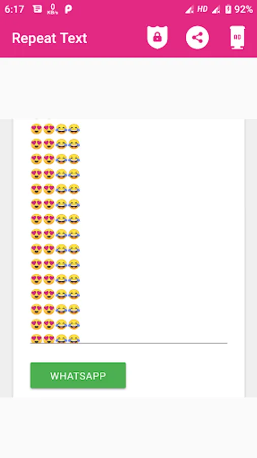 By using this application you can send the same message at multiple times. This app is combo pack for the all repetition app. It is one kind of message repeater to send message repeatedly, and also you can set your repetition limit with new line text repetition. Using this app you can also make repeated letters using alphabet and emoji characters. Also, provide random emoji characters. Very easy to use and required few click for your message repetitions. Repetition process works asynchronously for longer repetition limits.