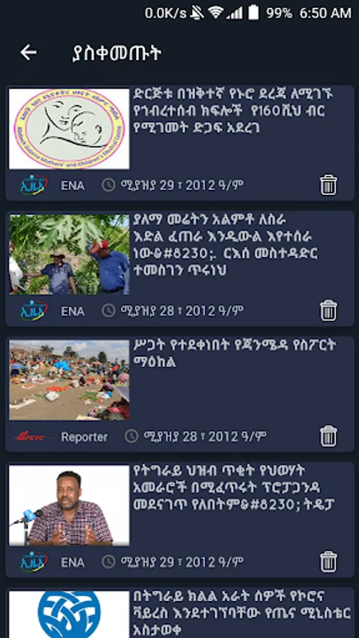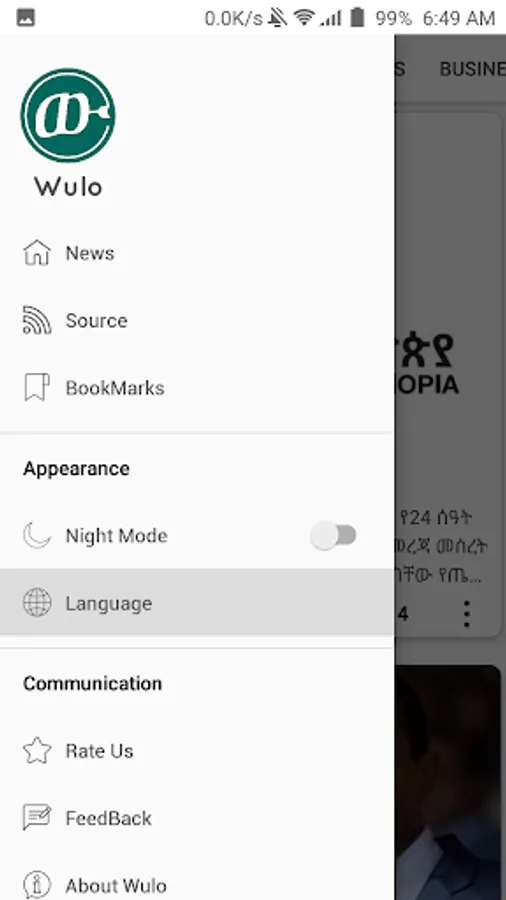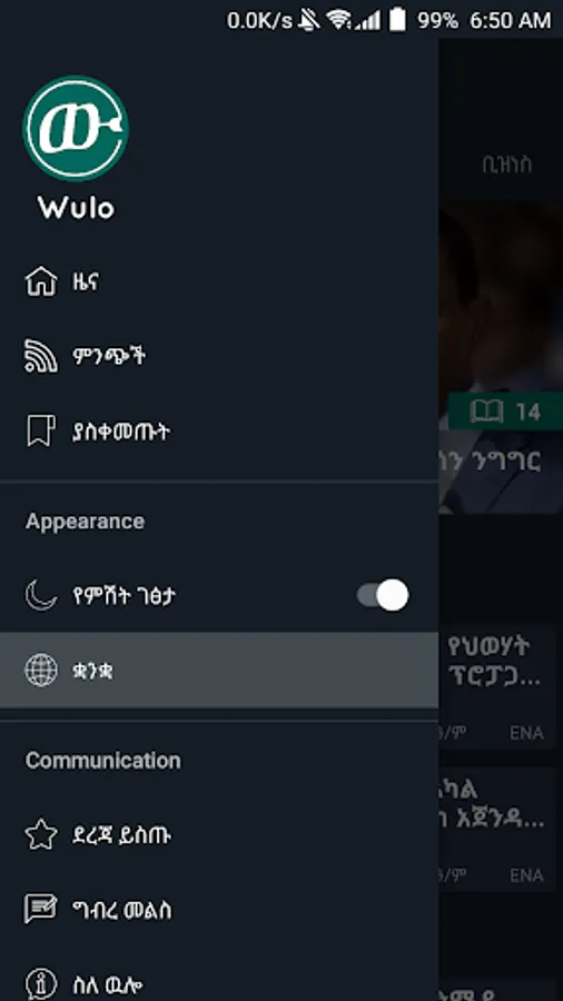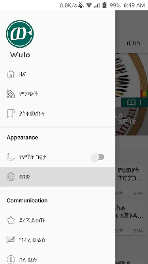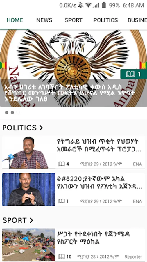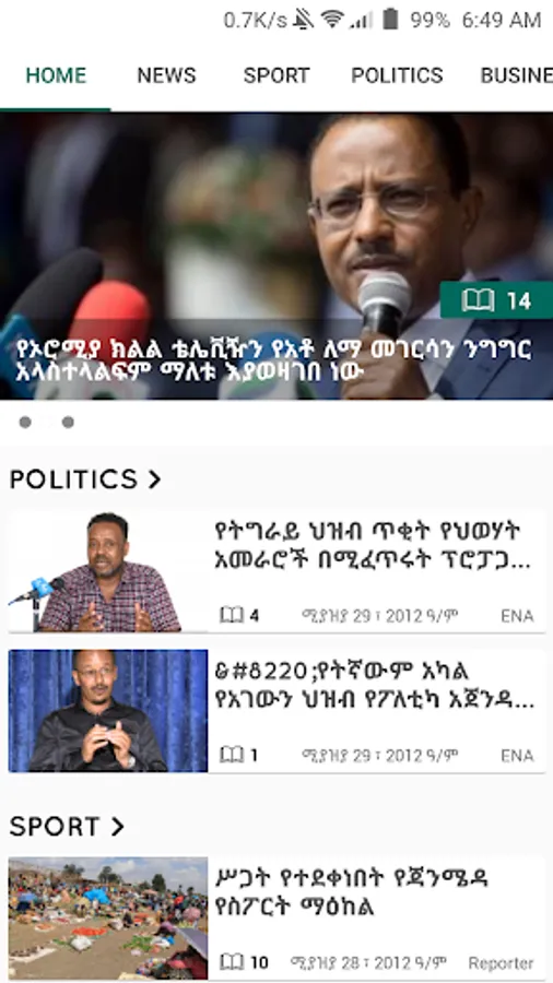 Select latest Ethiopian and world news(ዜና) from several category including News, Sport, Business and social by swiping to the right and left.
