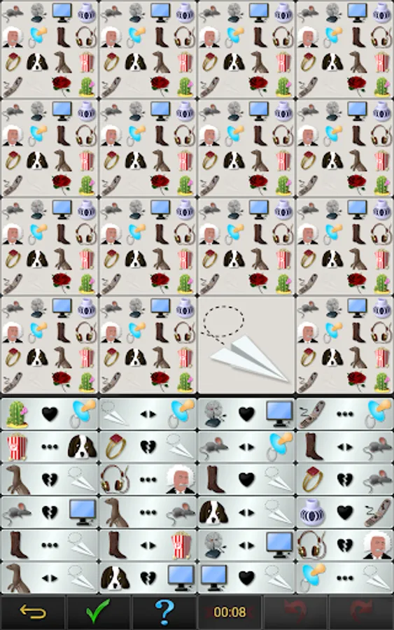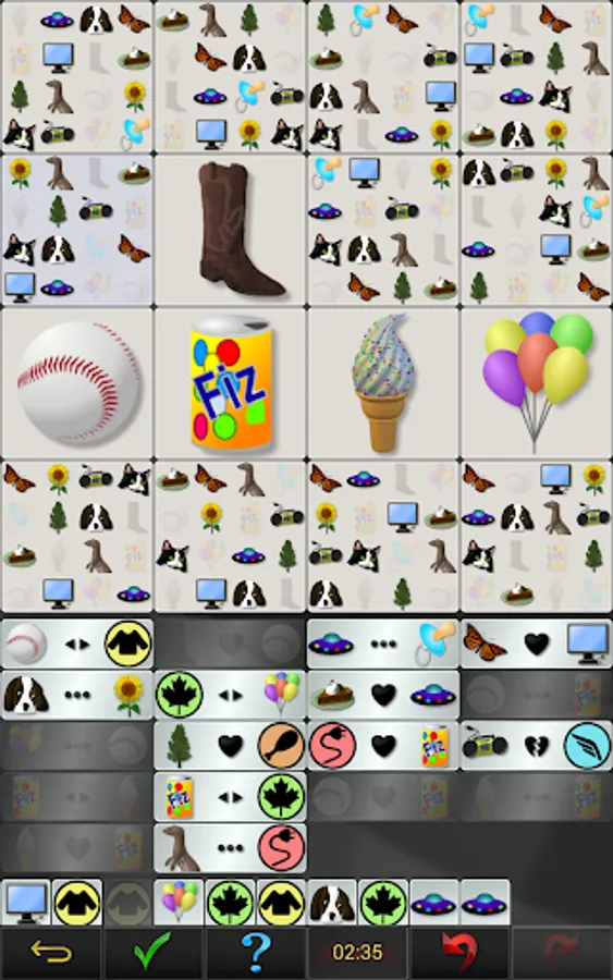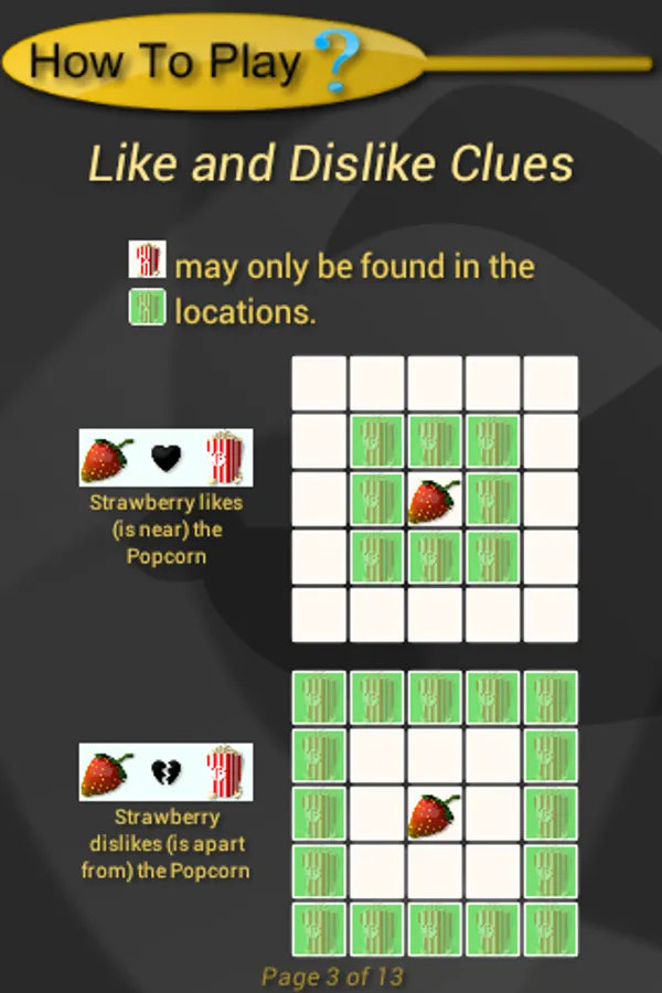 The game consists of a game board, a variety of images, and clues. Each square on the game board shows a small version of each image. Using the clues provided, and your powers of deduction, prune images from each square by tapping once on the square to enlarge it, and then again on the image to be removed. Continue this process until only one image remains in each square. If they're all in the correct square, you WIN!!
