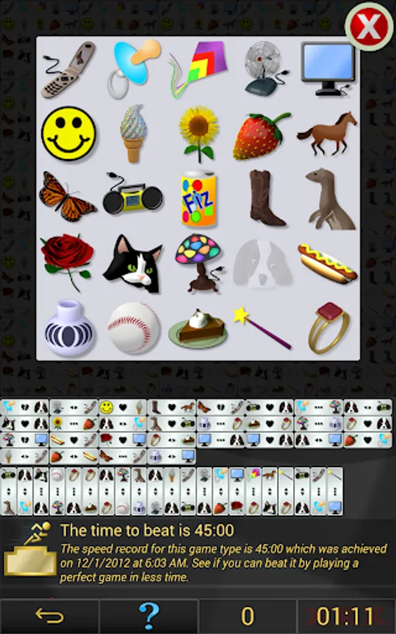The game consists of a game board, a variety of images, and clues. Each square on the game board shows a small version of each image. Using the clues provided, and your powers of deduction, prune images from each square by tapping once on the square to enlarge it, and then again on the image to be removed. Continue this process until only one image remains in each square. If they're all in the correct square, you WIN!!