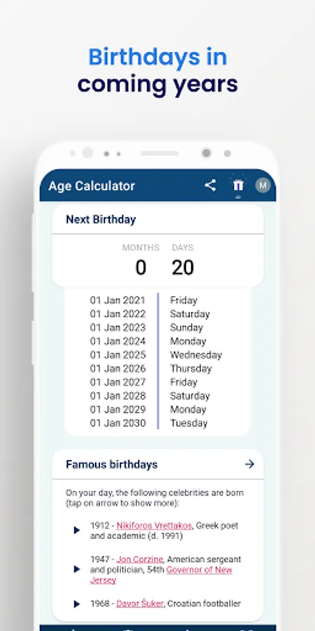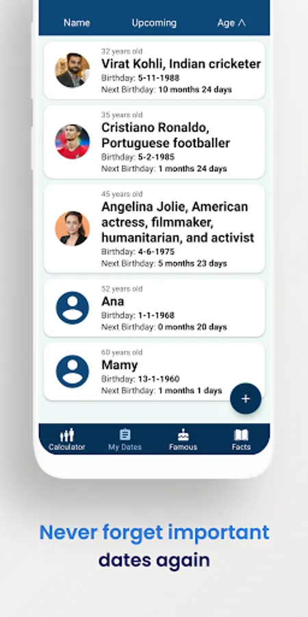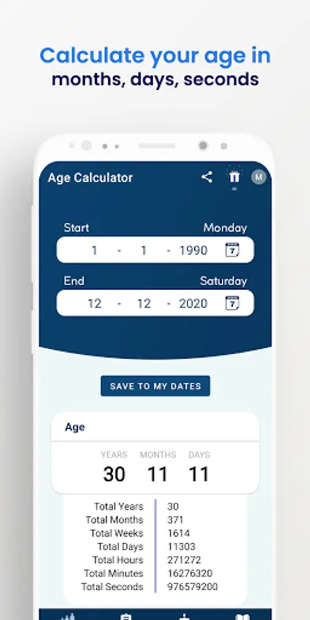 Easily calculate your exact age with Age Calculator! With a simple date of birth, the app calculates your age in years, months, days, and even seconds. Never forget important dates again by saving birthdays and anniversaries within the app. Get reminders for upcoming birthdays and anniversaries, and calculate the difference between two dates down to minutes and seconds.
