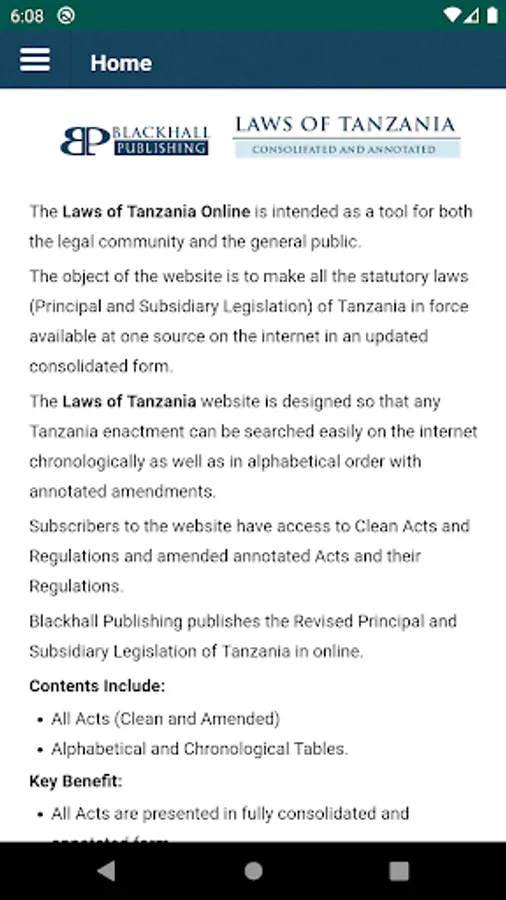 The Laws of Tanzania Mobile App is intended as a tool for both the legal community and the general public.