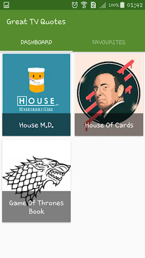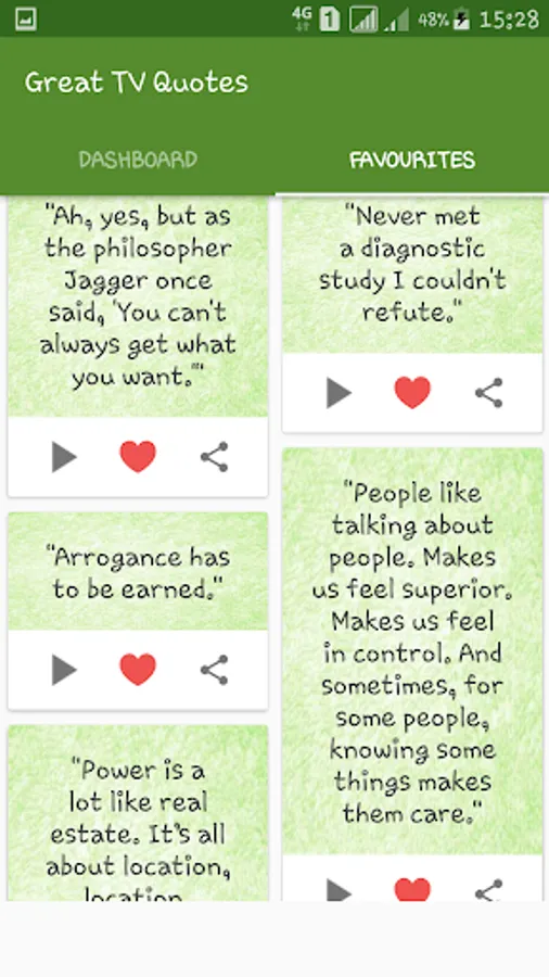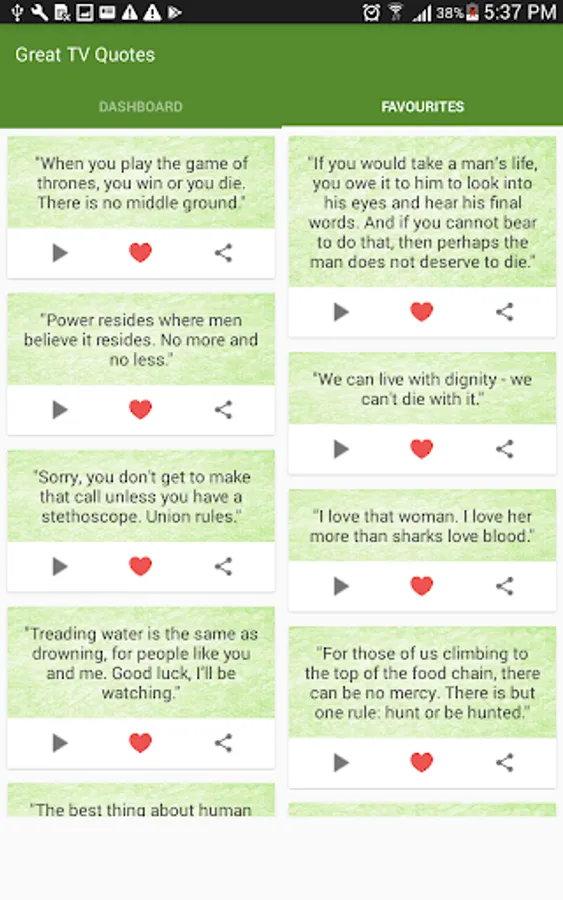 Great TV Quotes - Collection of some of the best quotes from your favourite TV Series. Download the free app and browse through the list of quotes, mark them as favourite, share them with your friends and even listen to them.