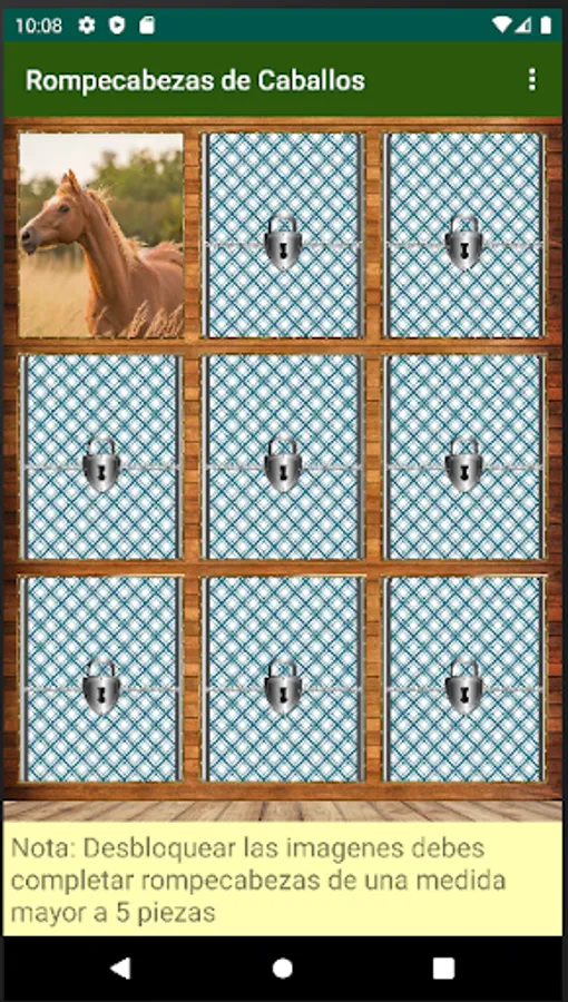 🐴 Tiene mucha variedad de imágenes y para desbloquear cada imagen debes elegir los rompecabezas mayores a 6x6 y al completarlo desbloquearas la siguiente imagen.