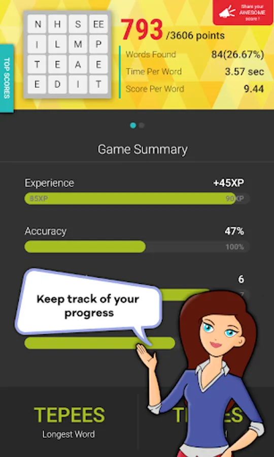 * Detailed Leaderboard: Compare your word search skill vs other players’.