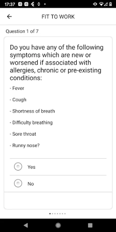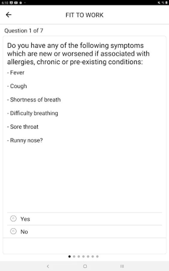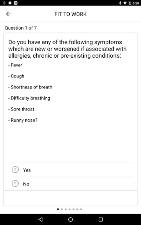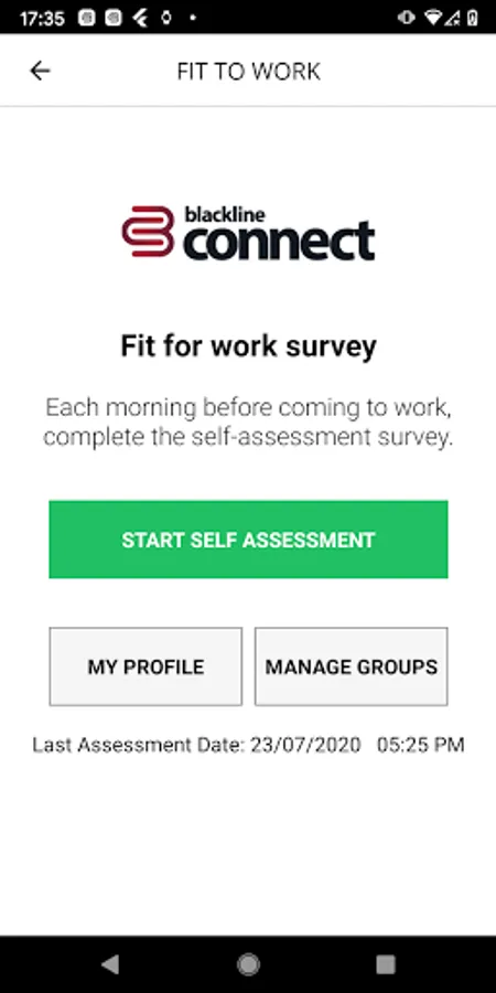 Upon startup, Blackline Connect provides the option to survey users daily with a simple series of Yes/No questions to assess their readiness for work that day. Survey results are available only to the authorized health and safety team and supports the assessment of employees’ readiness for work.