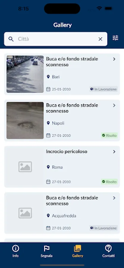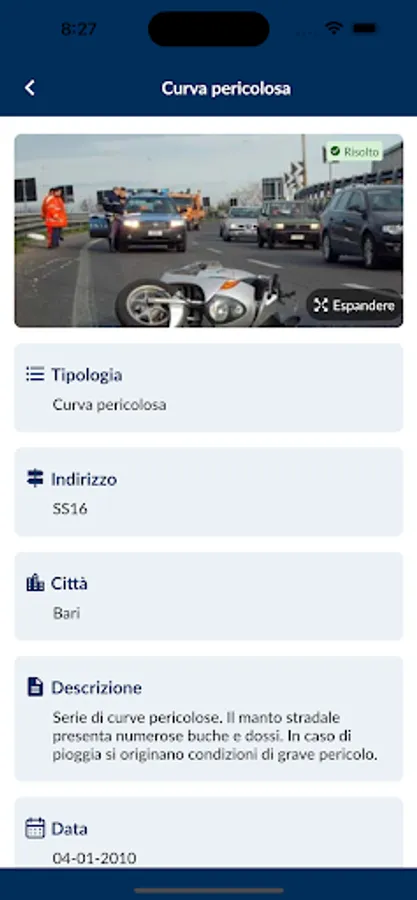 In this way you will contribute to increase the database of reports. The ANIA Foundation will solicit the solution of the Blackpoint from the Authority responsible for the road (Municipality, Province, ANAS, etc.) and publish the reports on the portal http://blackpoint.smaniadisicurezza.it