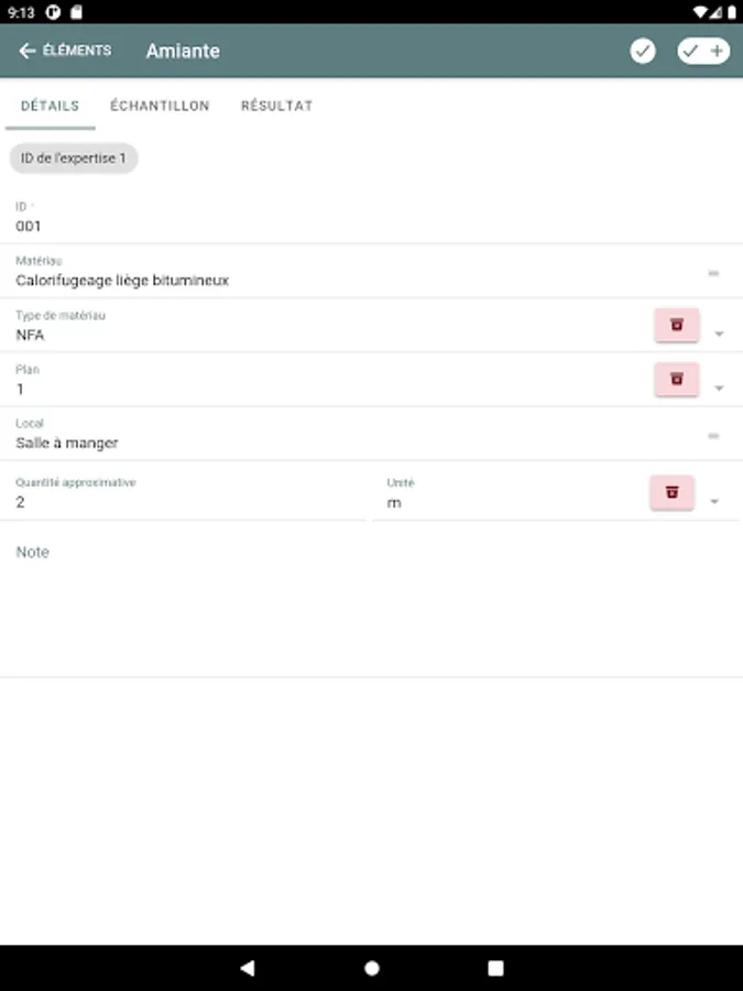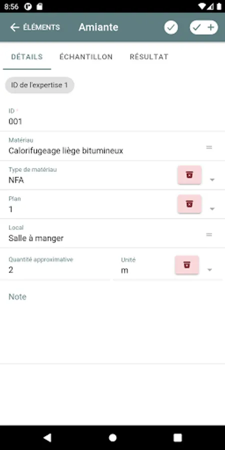 • Elements/Samples management (photos, characteristics and location on the plan)