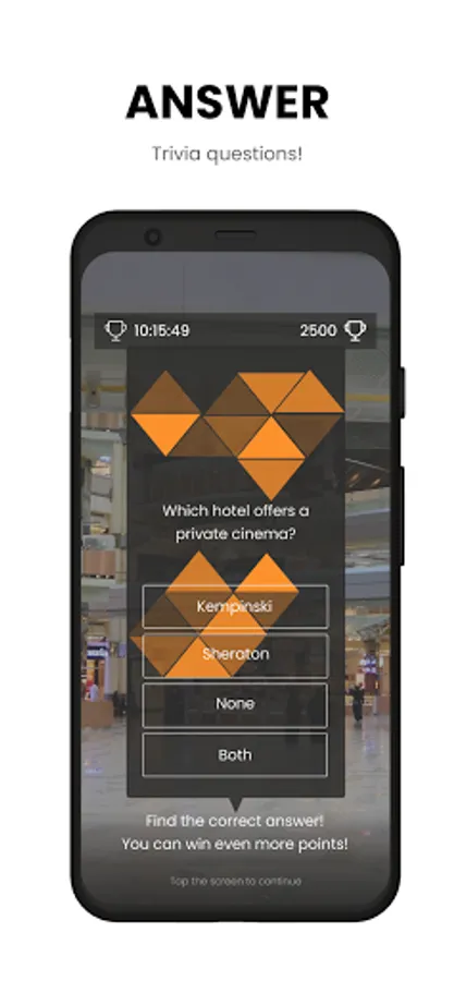 •Find hidden treasures, answer trivia questions and unlock different mall zones to earn points