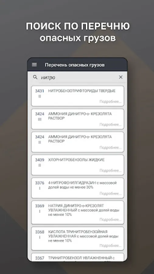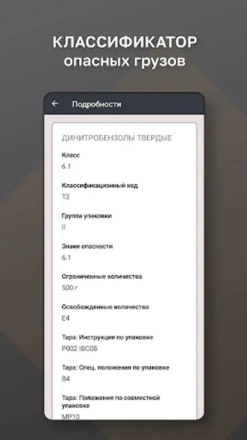 The application contains a complete List of dangerous goods with UN specifications with the ability to quickly search!