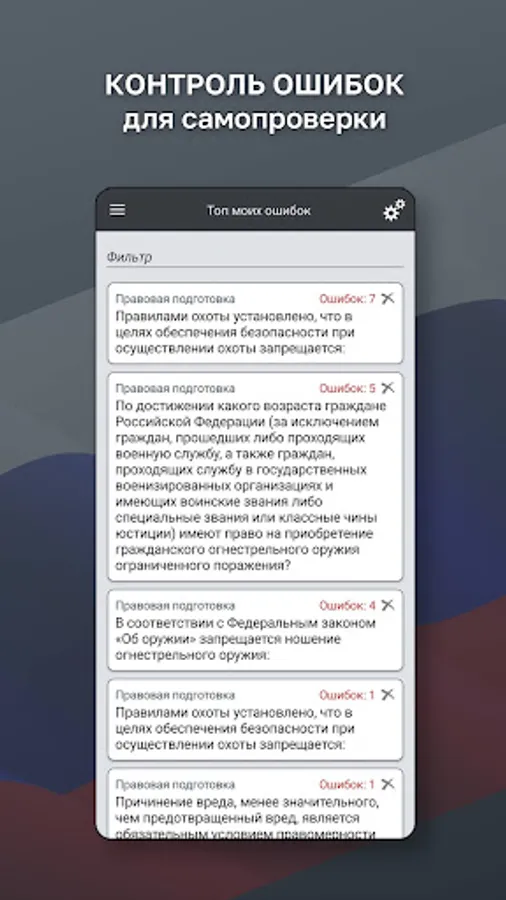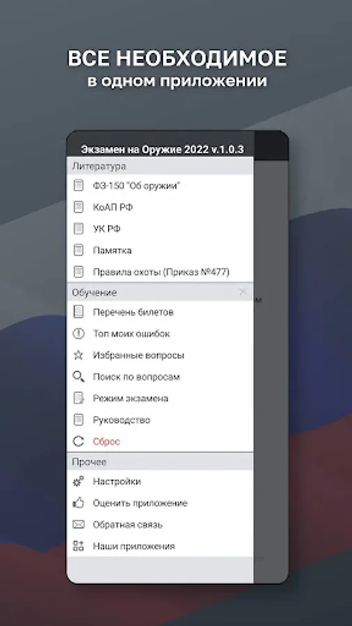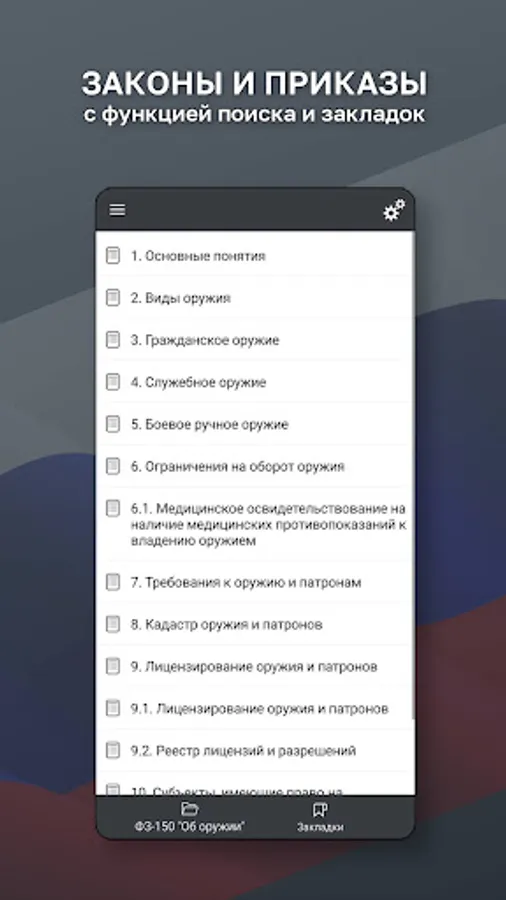 - Contains a list of grounds for revoking a weapon license, as well as the texts of current regulatory legal acts in the field of handling firearms and hunting with a convenient breakdown by topic (FZ-150 "On Weapons", articles from the Criminal Code of the Russian Federation, articles from the Code of Administrative Offenses of the Russian Federation, Order 477 etc.)