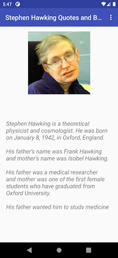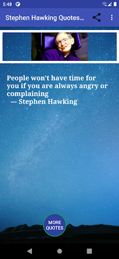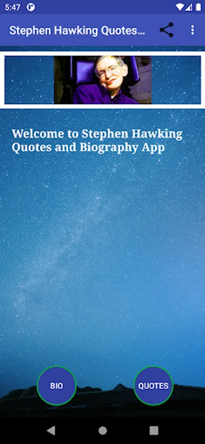 Stephen Hawking Quotes and Biography is a basic app, which has collection of quotes of theoretical physicist and cosmologist Hawking and a short bio.