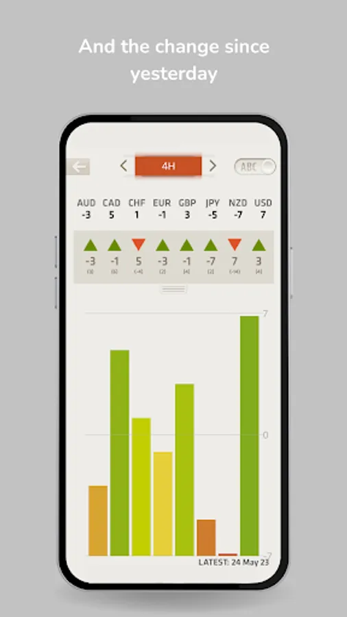 - How the current and yesterday's strength/weakness of each currency relates to the other currencies (e.g. weaker, stronger, equal)
