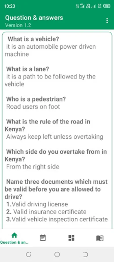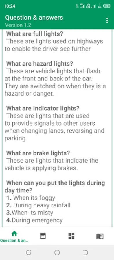 The app contains common questions and answers asked in a driving test exam. When you take your driving test, you will be asked to identify road signs and answer questions about the rules of the road.
