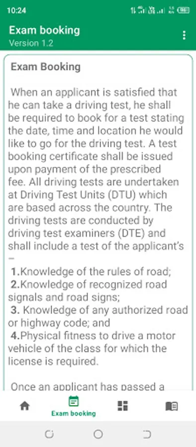 The app also contains information on the exam booking process and requirements.