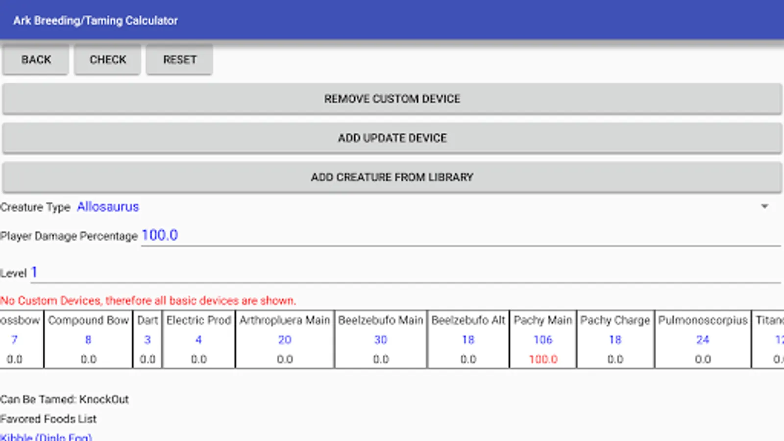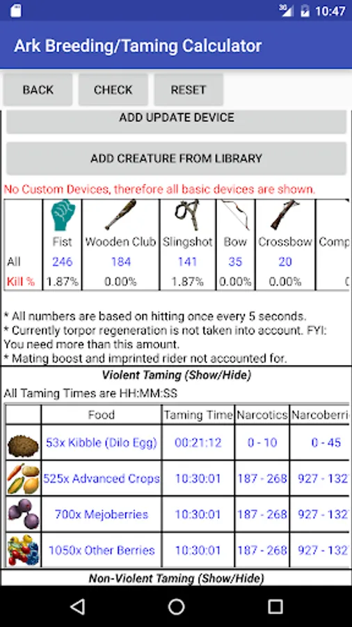 Taming calculations Knockout calculations, food amounts, narcotic amounts, and time for both knockout and passive taming.