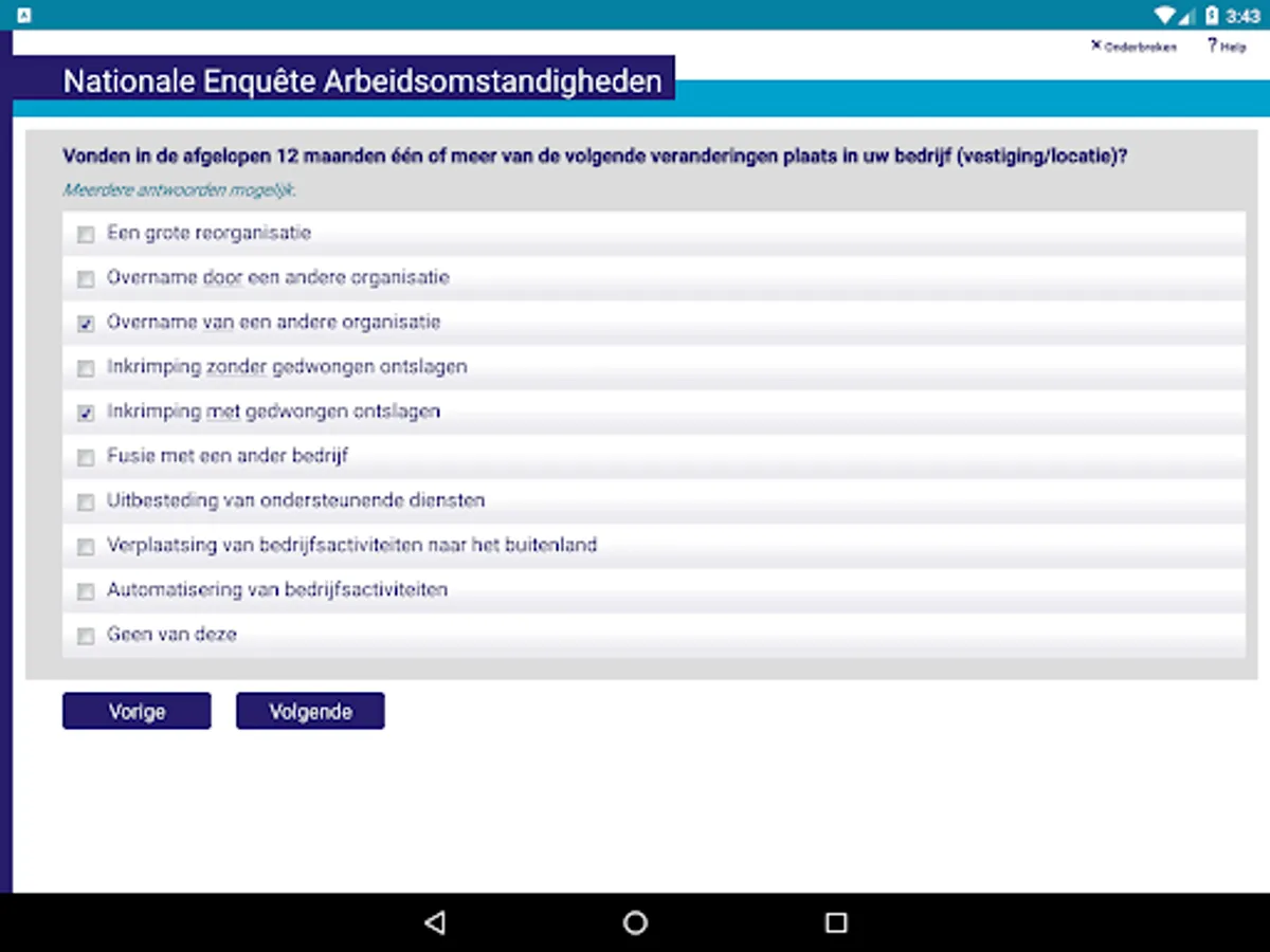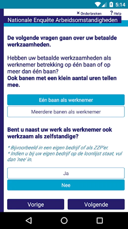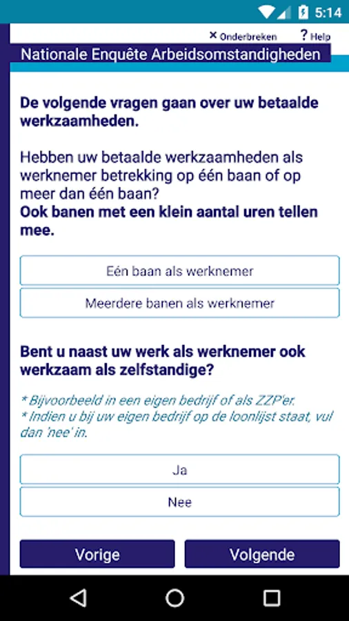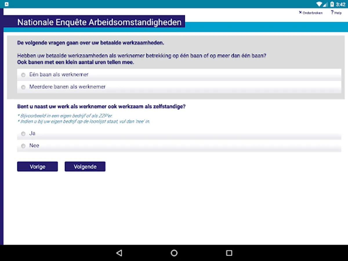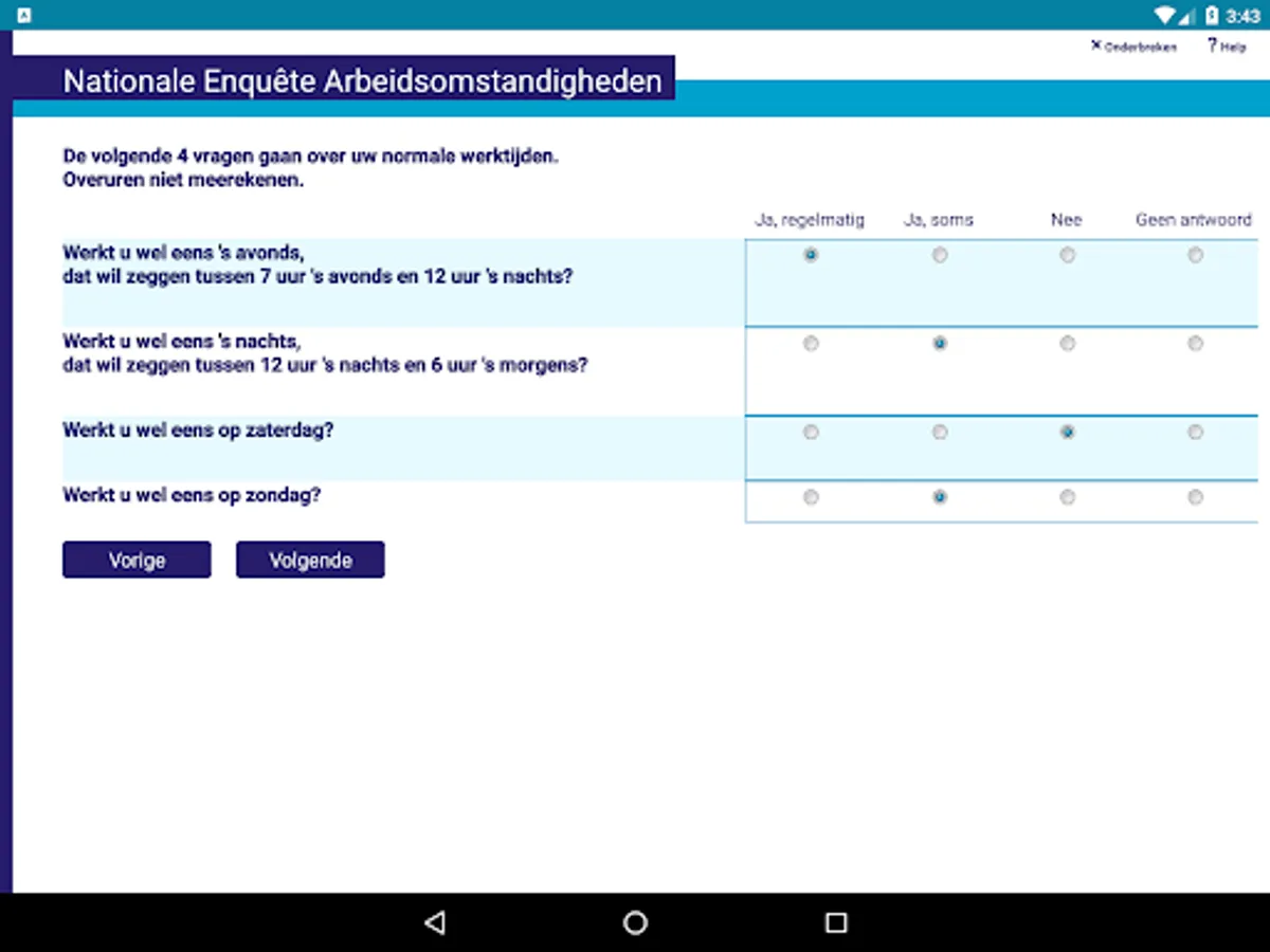 For online surveys it is required to have an internet connection during the duration of the survey, since the survey is running on a Blaise server park in this case. The app sends the answers to the questions to the server and the server calculates a response based on the given answers and the rules and checks that have been defined for the survey. The response is send back to the app and displayed to the user.