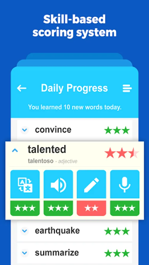 Learn 10 words every day to improve your vocabulary. It is important that you learn in a balanced way. More words learned do not mean that you can always remember them. Therefore, the number of words you can learn has a daily limit.