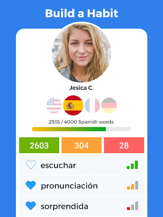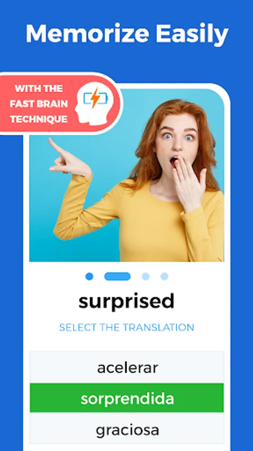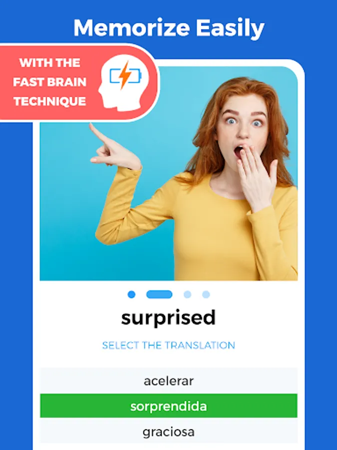 Our unique memorization technique requires you to see a photo and read the word description in your native language. You can also swipe to listen to the word and read the definition of the word in the original language too.