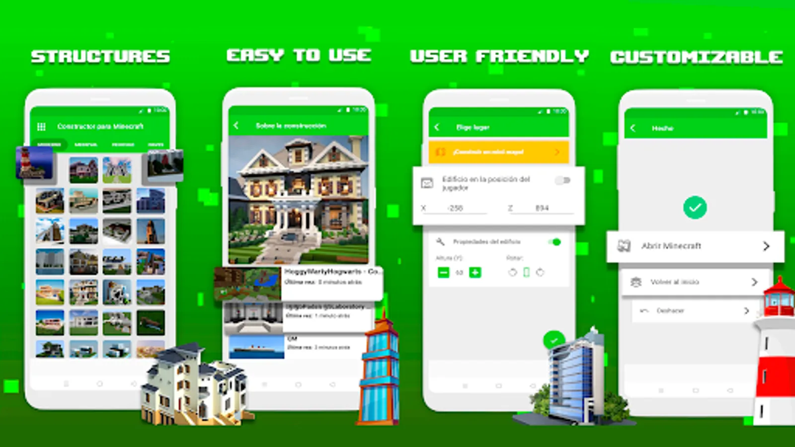 You'll find all kinds of buildings for minecraft and structures with easy installation with Mod Builder for Minecraft that allow you to customize your Minecraft experience by adding new building materials, tools, and features: from houses (minecraft house builder), cities, castle minecraft, adventure maps, puzzle, skywars, and much more inside!