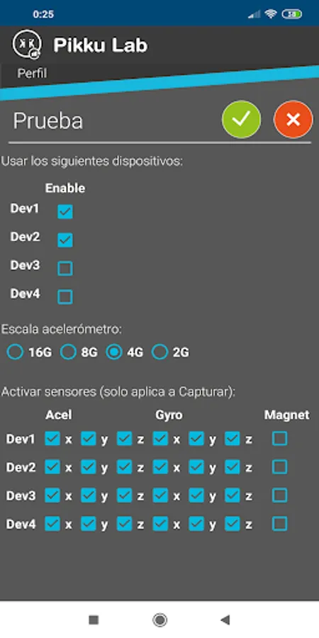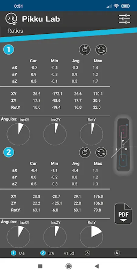 It allows to connect with up to 4 Pikku wireless sensors providing functionality to visualize and store data from the accelerometer, gyroscope and magnetometer. The visualization is done through real-time graphics, calculation of real-time ratios and creation of videos with images and graphics simultaneously. You can capture data from the devices in spreadsheet format for later analysis.