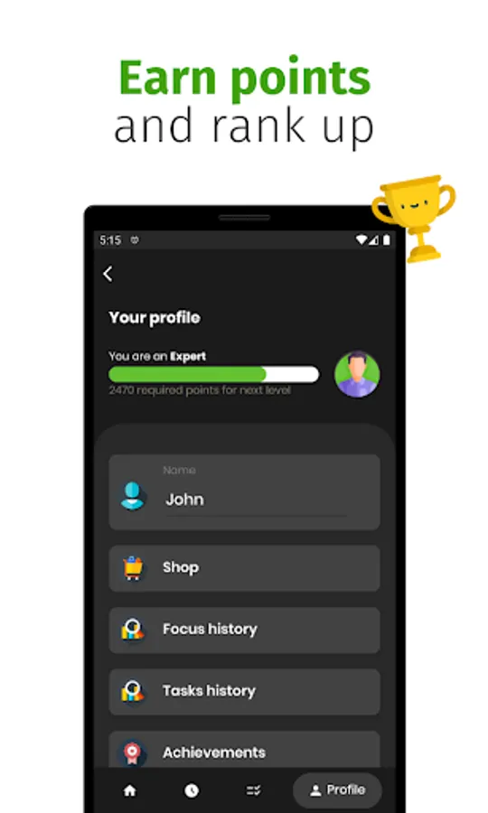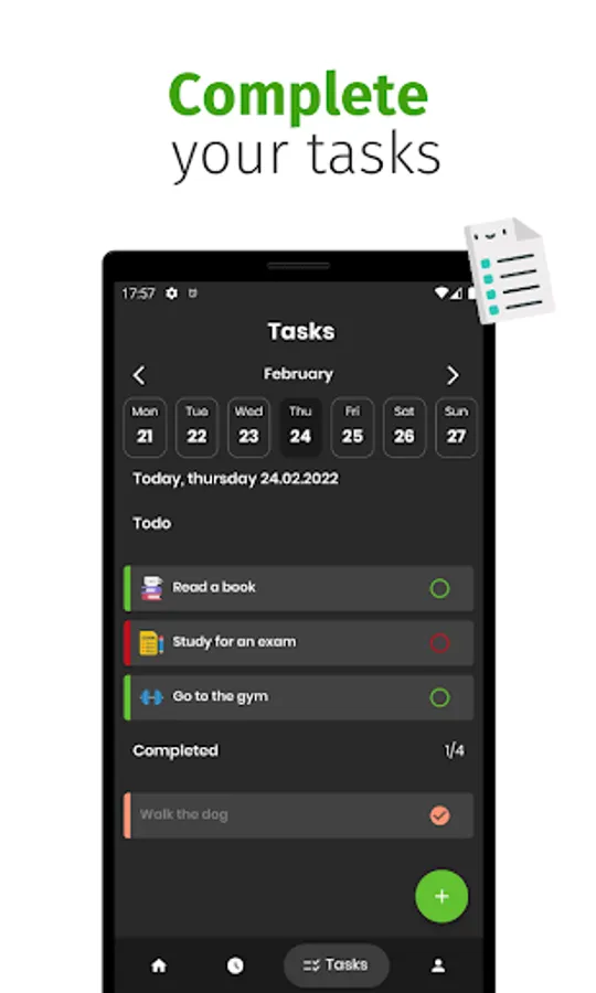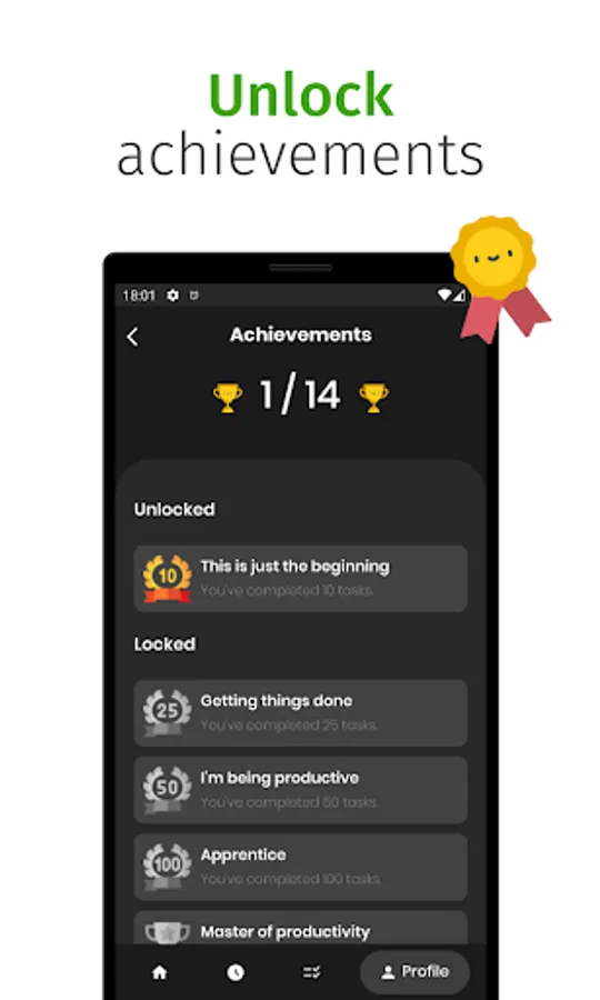Simply add a task with title and description. Choose a color and icon. Earn points with each completed task and boost your rank.