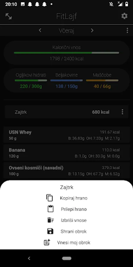 - food intake and tracking of calories and macros consumed,