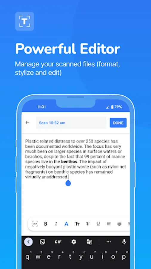 Text Scanner is an OCR app which helps you identify and extract text from images on the go. Scan anything (receipts, notes, documents, photos, business cards, and whiteboards) with this text recognition app.