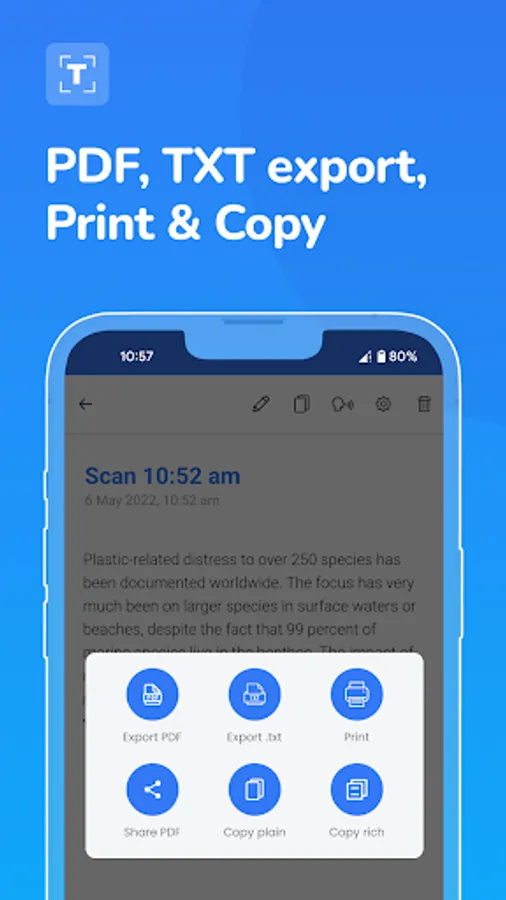 Once you have converted an image into text, you can save it in different formats, including TXT, PDF and more. You can also print the scanned text with a single click using OCR Text Scanner’s dedicated print feature.