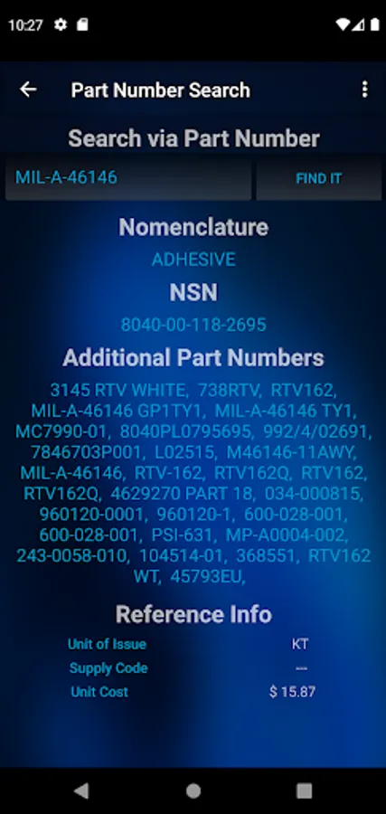 MX Express is a first of its kind application allowing users in the Maintenance world fast access to searches for part numbers and national stock numbers (NSN) right on their mobile devices! No need to worry about trying to load clunky services such as PubLog WebFLIS or FED Log. Also supports your very own custom Quick Reference List, saved right on your device allowing for personal secure offline access to those commonly ordered parts.