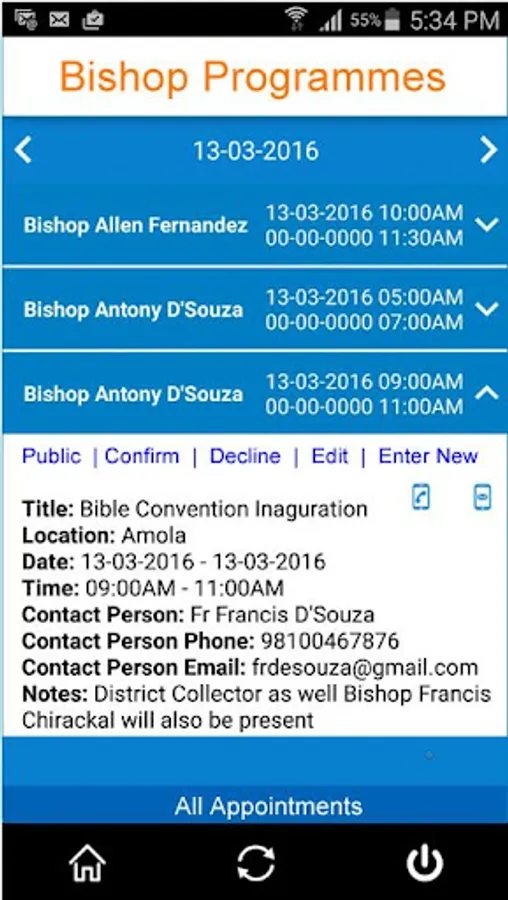 Bishops Programmes: Available to parishes, priests and bishops to view confirmed, public programmes of all bishops. If the appointment is private, it will display Engaged. When a Bishop login to his module, he can add, edit, confirm, decline and view all appointments. The app will sync with the entries done by Secretary. Bishop can also directly call or email from the app.