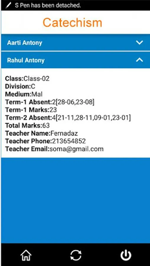 Catechism: This will display details of catechism students of that particular family. Details include, marks, date if a student is absent in catechism, teacher name and contact details, Class, medium and division. The intend is to monitor children's catechism activities by their parents.