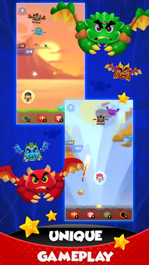 An action is incomplete without power-ups. Get the most of 11 unique power-ups with amazing visuals and effects and defeat different kinds of dragons and most powerful boss dragons.