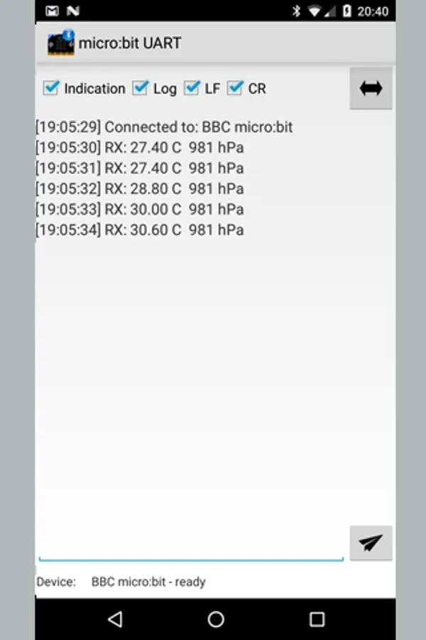 This app communicates between Android and a micro:bit device. You can transmit and receive text in 'notification' or 'indication' mode. The UART communication also has to be implemented at the micro:bit device (Block, Javascript, MBED).
