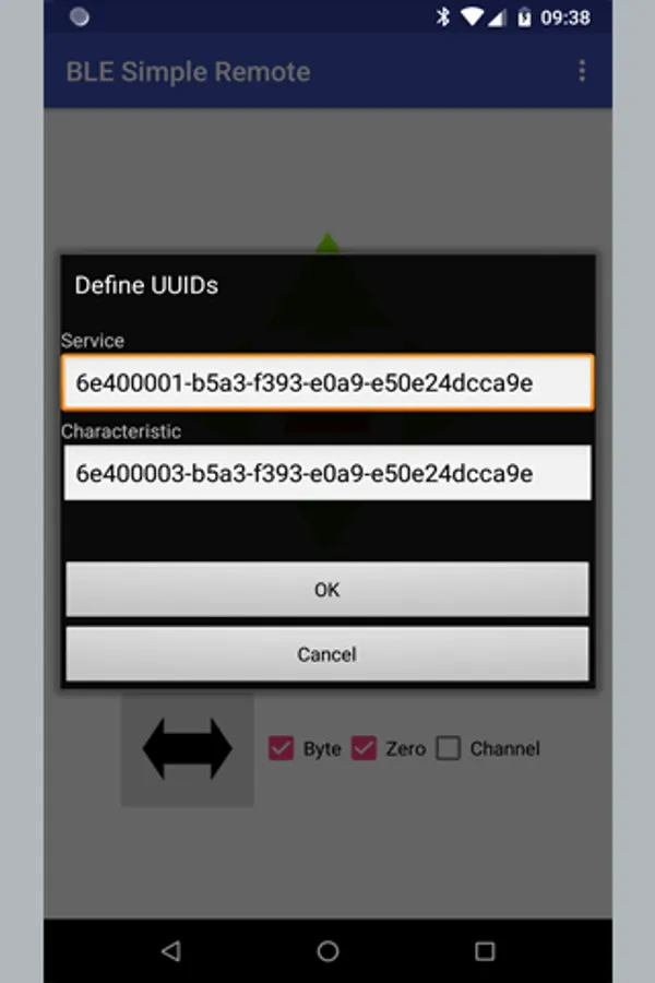 Default the Nordic UART UUIDs are used for service and characteristic. You can change them with the option menu Configuration.