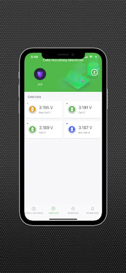 2 az egyes elemek valós idejű feszültségét és riasztási státusát mutatja. Ha a jelentett paraméterek kiváltják a riasztási értéket vagy védelmi értéket, a riasztást fel kell hívni;